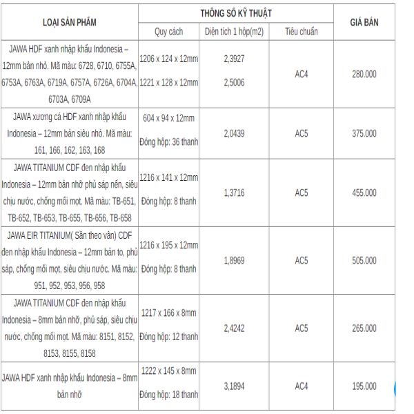 BẢNG BÁO GIÁ CÁC DÒNG SẢN PHẨM CỦA SÀN GỖ JAVA