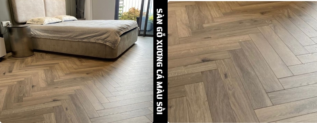 + kiểu xương cá (herringbone) đầy nghệ thuật, tạo nên một hiệu ứng thị giác ấn tượng và độc đáo. Tông màu sồi nâu tự nhiên mang đến vẻ đẹp ấm cúng, sang trọng, dễ dàng kết hợp với nhiều phong cách nội thất từ cổ điển đến hiện đại.