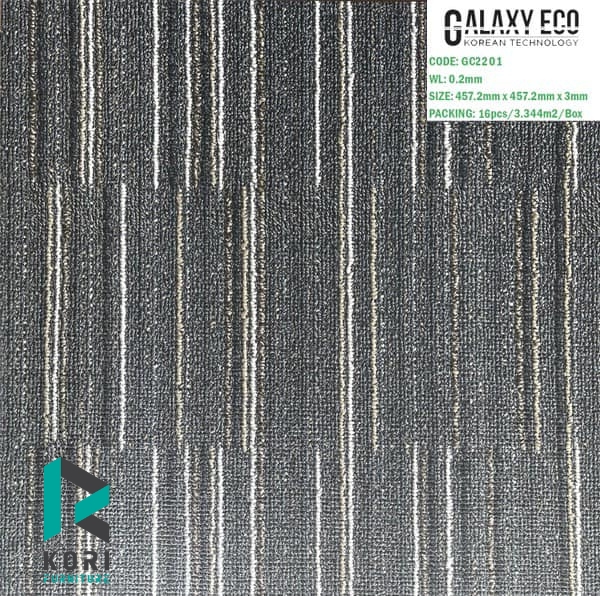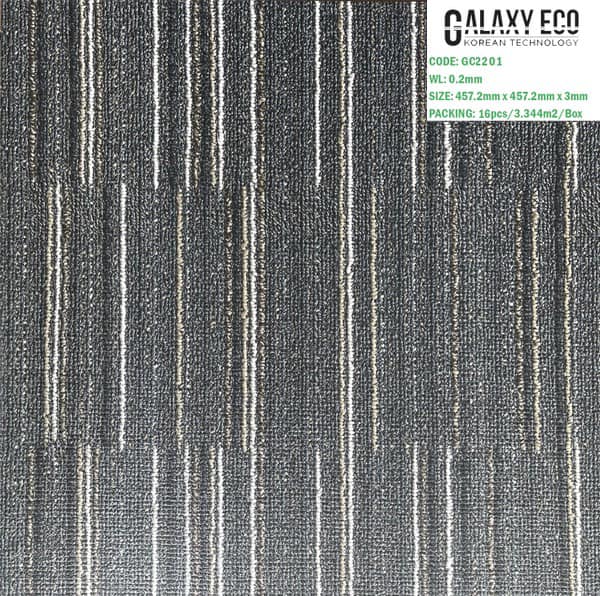 Sàn nhựa Galaxy 2201 có vân thảm đẹp. Ván sàn nhựa chính hãng không thấm nước, không mối mọt, không cong vênh co ngót, chống cháy, chống trơn trượt. Khó bị tác động bởi nước tẩy. Kích thước 455mm x 455mm x 3mm. Bề mặt : Vân thảm.