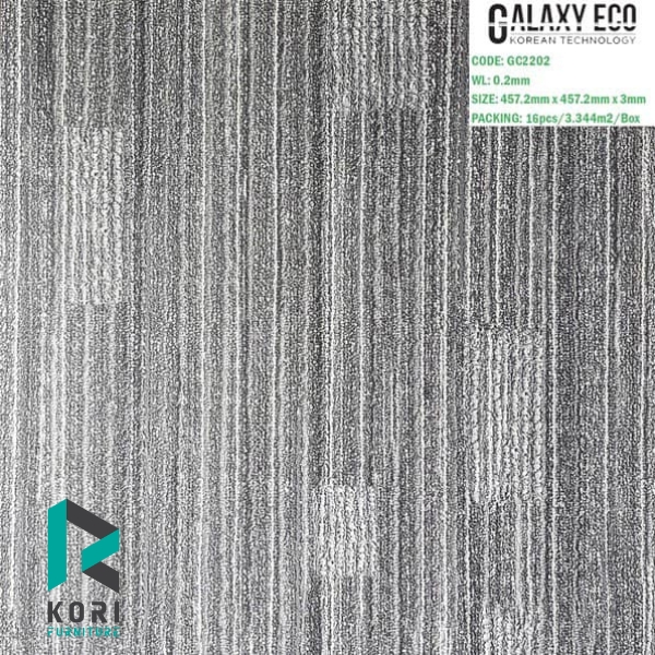 Sàn nhựa Galaxy 2202 có vân thảm đẹp. Ván sàn nhựa chính hãng không thấm nước, không mối mọt, không cong vênh co ngót, chống cháy, chống trơn trượt. Khó bị tác động bởi nước tẩy. Kích thước 455mm x 455mm x 3mm. Bề mặt : Vân thảm.